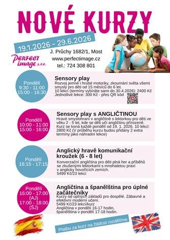 níže naleznete nejnovější nabídku kurzů angličtiny, španělštiny a sensory play od ledna 2026. Rádi Vám vystavíme dárkový poukaz pod stromeček.